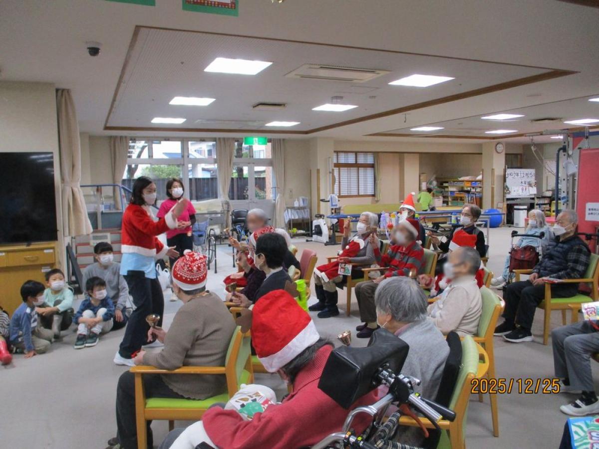 最後に、園児さんからプレゼントをいただき、利用者の皆様からはハンドベルの演奏と指人形のプレゼント。 利用者様からは「元気をもらえた」「子どもたちと触れ合えて楽しかった」といった感想をいただきました。これからも地域の皆さまとつながりを大切にしながら、交流の機会を続けていきたいと思います。