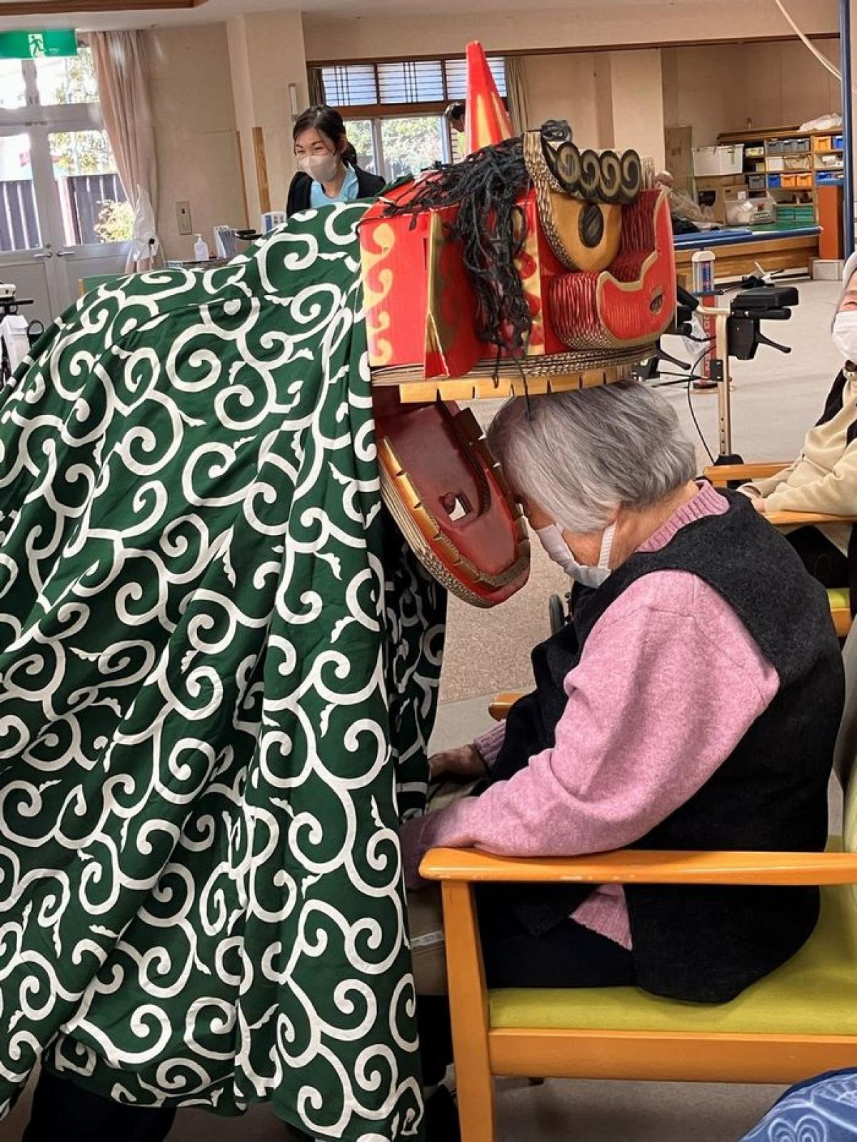 獅子舞の登場で新年会がスタート 「頭を噛んで~」「私は足を噛んで~」と皆さんからのリクエストに獅子舞も大忙し😅💦
