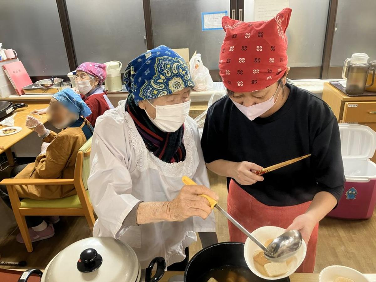 本日のおすすめメニューは、おでんとお好み焼き🏮 利用者さんと一緒に調理しました。 おでんは朝からじっくり仕込んだおかげで、大根がしっかり味しみでいい感じです🍢 「枝豆やおつまみセットもいかがですか~」と、女将役の女性利用者さんが元気に声をかけてくださり、 居酒屋さながらのにぎやかな雰囲気に。