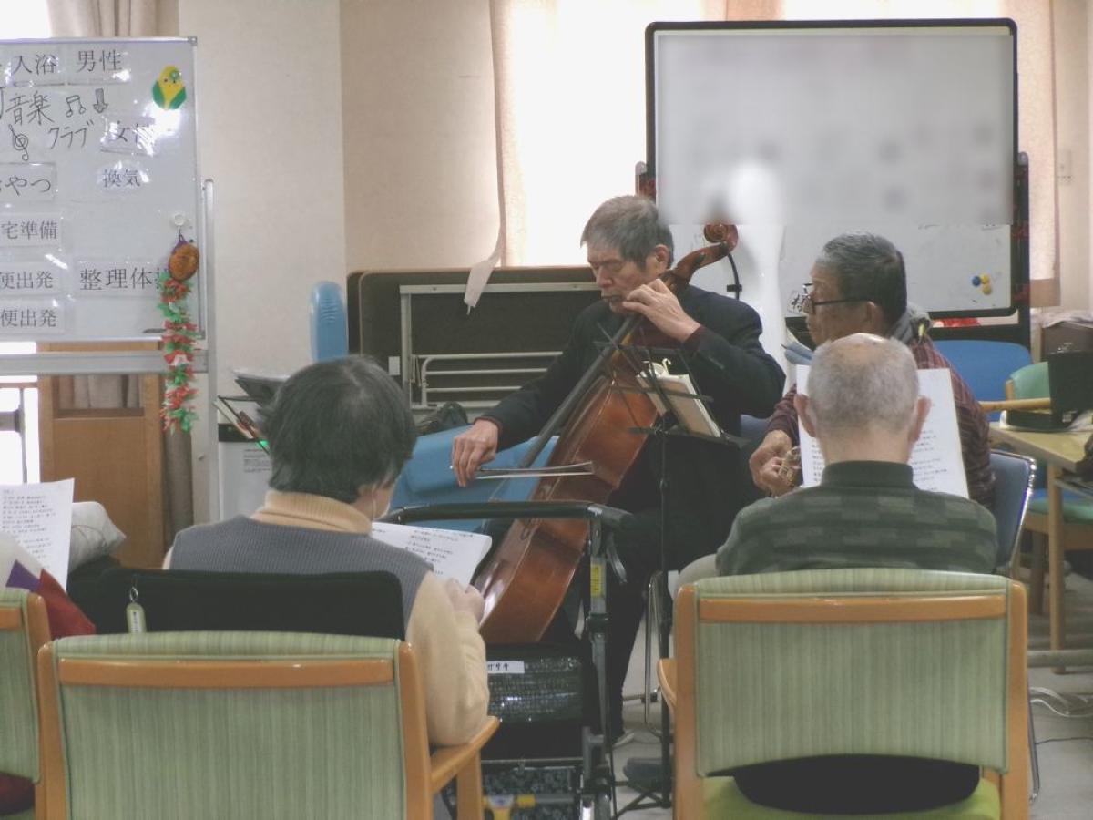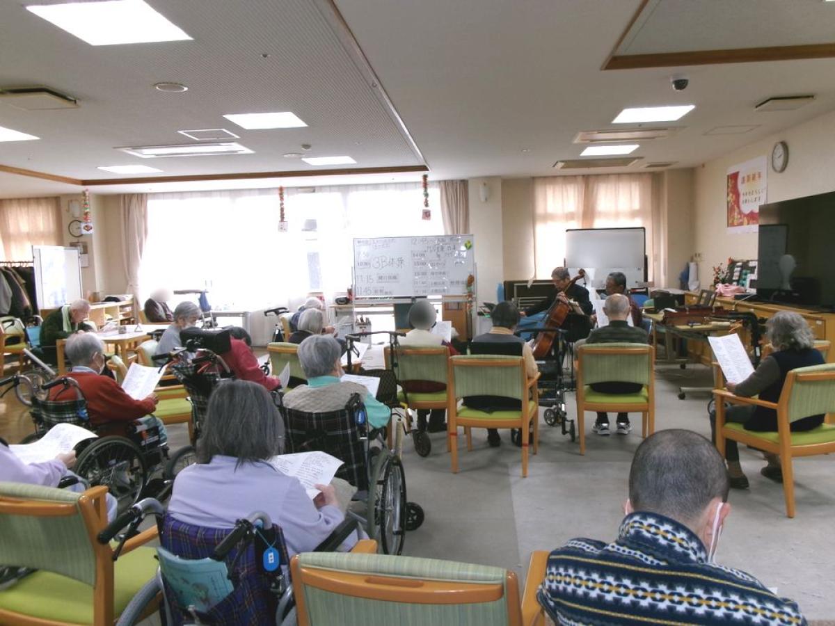 普段はなかなか触れる機会のないチェロやギター、ハーモニカにリコーダーといった生の演奏に、皆さまは興味深そうに耳を傾け、曲に合わせて手拍子をしたり、口ずさんだりと、音楽の楽しさを存分に感じておられました。